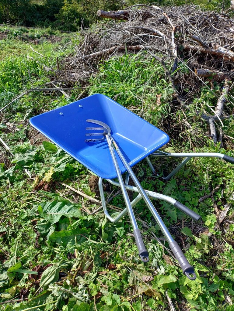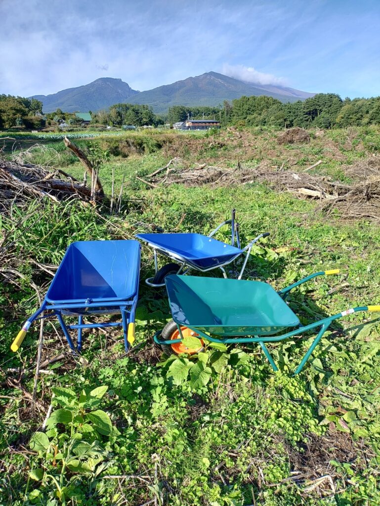 もともと雑木林だったので少々モコモコしています。草を刈り、刈って積んでくれていた藪の山を動かそうと一輪車を買ってきました。軽くていい!と思ったらこれはアルミ支柱のプラ皿でした。草は運べるけど石や土積んだら割れちゃうじゃん。でも、この軽さと走破性には助かっています。使い分けです。