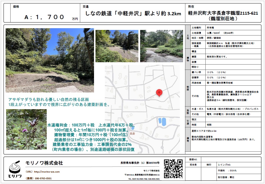 星野エリアから約2.4㎞の立地、旧軽井沢方面へも渋滞なく抜けられる「鶴溜別荘地」内の物件です。
