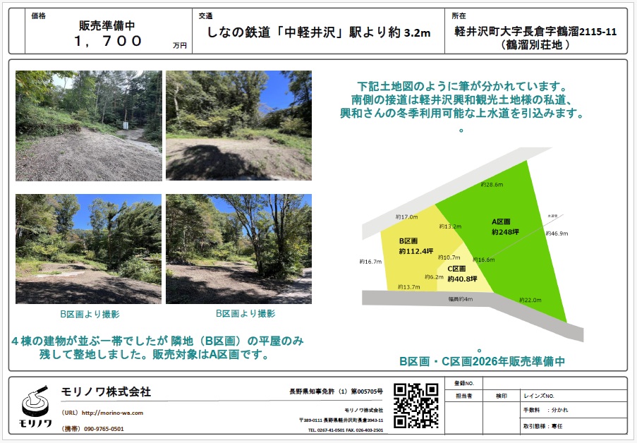 現在、販売対象となっているのはA区画のみですが、B・C区画も販売準備中です。3区画合わせますと401坪。
