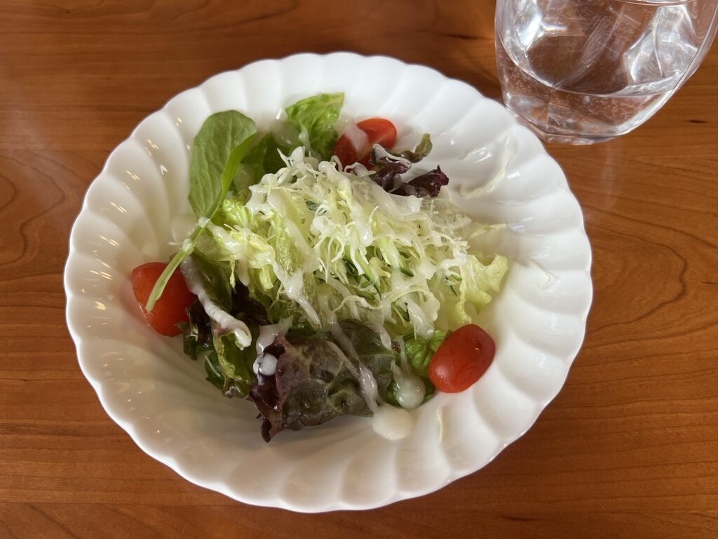 サラダも、何気ないのですが、キャベツがふわふわで、フレンチドレッシングの味のバランスも良くて、愛情がこめられているなぁと感じます。お水も、身体にやさしい「水素水」!
