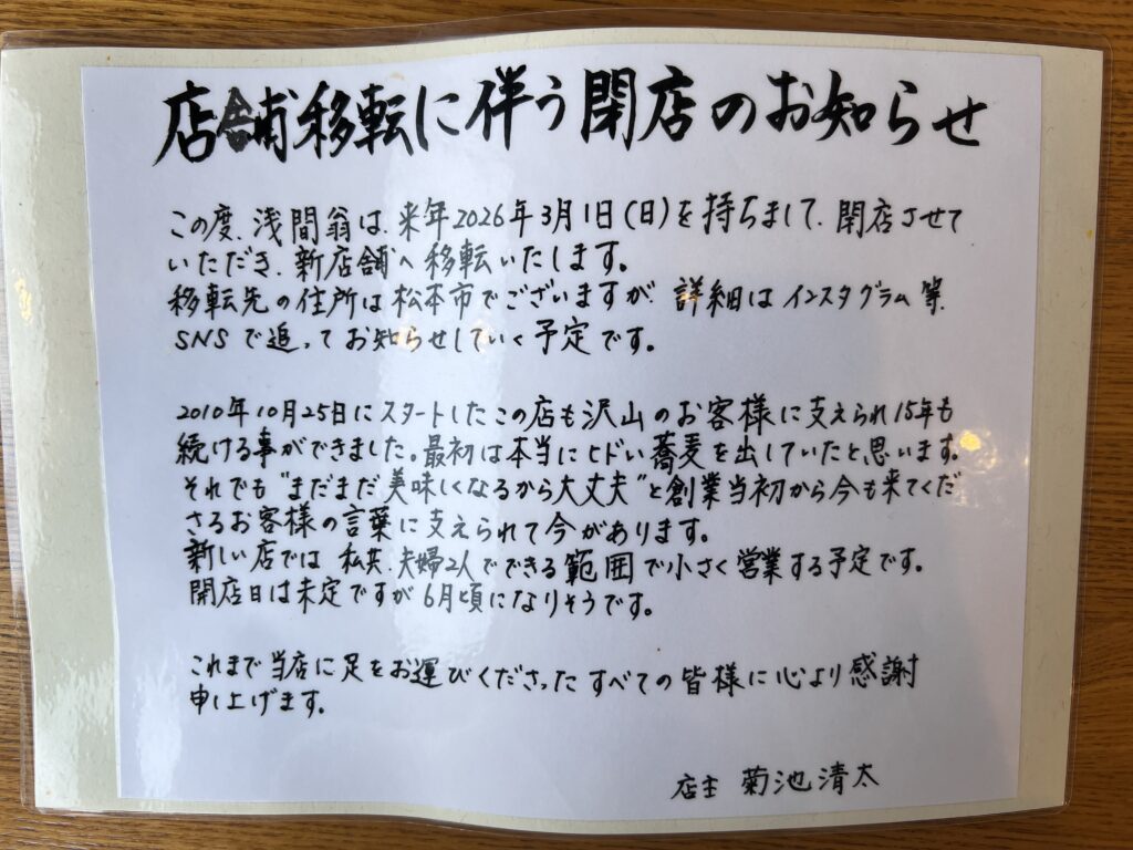 御代田にある蕎麦店「浅間翁」さんが、今年3月1日をもって閉店し、松本へ移転されるそうです。
