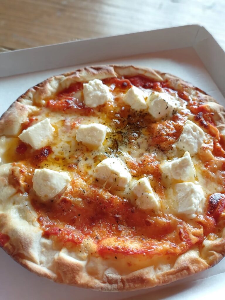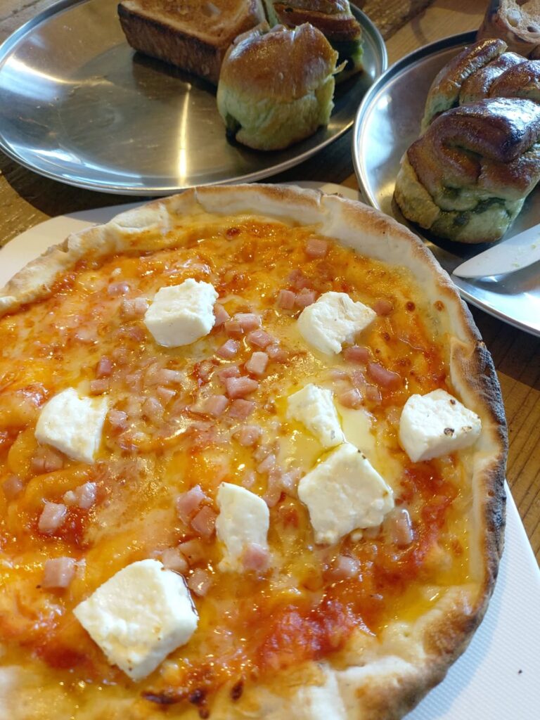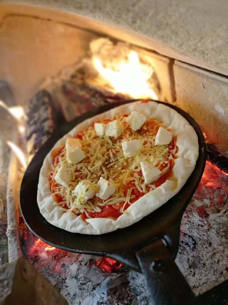 市販の手ごろなピザに オリーブオイルとチーズと胡椒などを足して薪ストーブ炉内で焼くと、薪の香りも足されてシャクッツと香ばしく美味しく楽しめます。