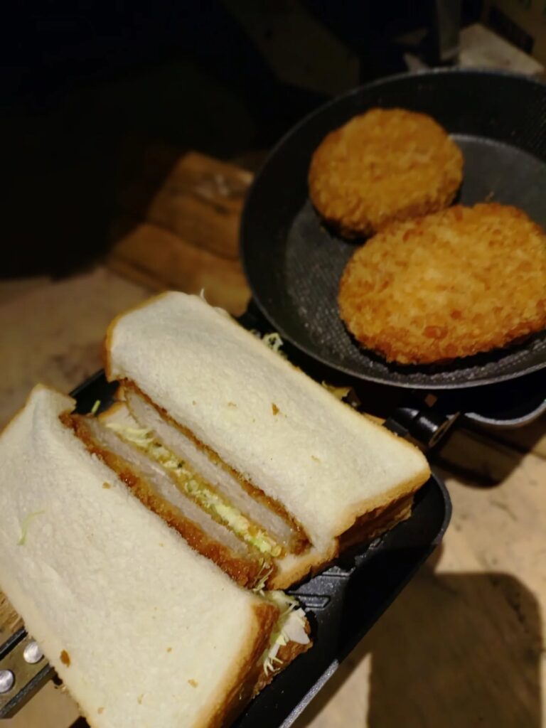 某コンビニのコロッケメンチやカツサンドも ホットサンドメーカーに挟んで炉内で焼けばご馳走なおつまみに。