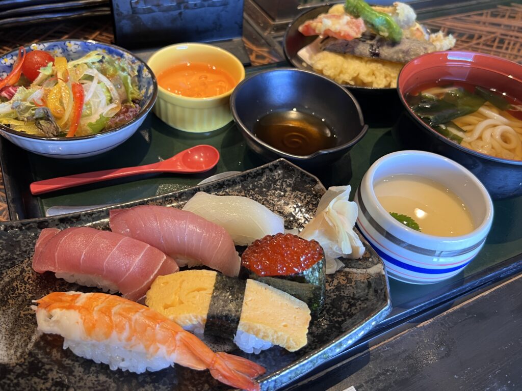 お寿司6貫に、サラダ・天ぷら・茶碗蒸し・うどん・デザートまでついて税込1460円♪