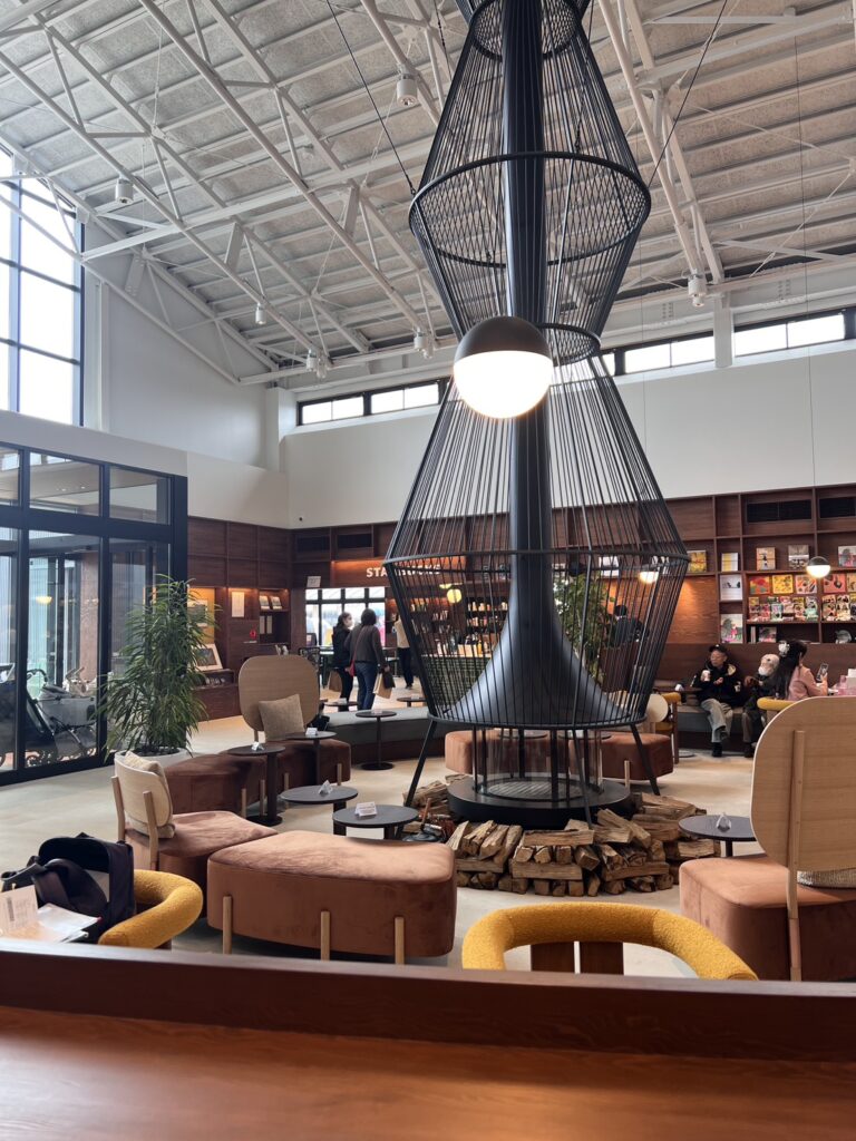 天井がとても高く開放的な空間。左手にスターバックスの店舗。中央はスターバックスを購入した方が利用できるシェアラウンジ。