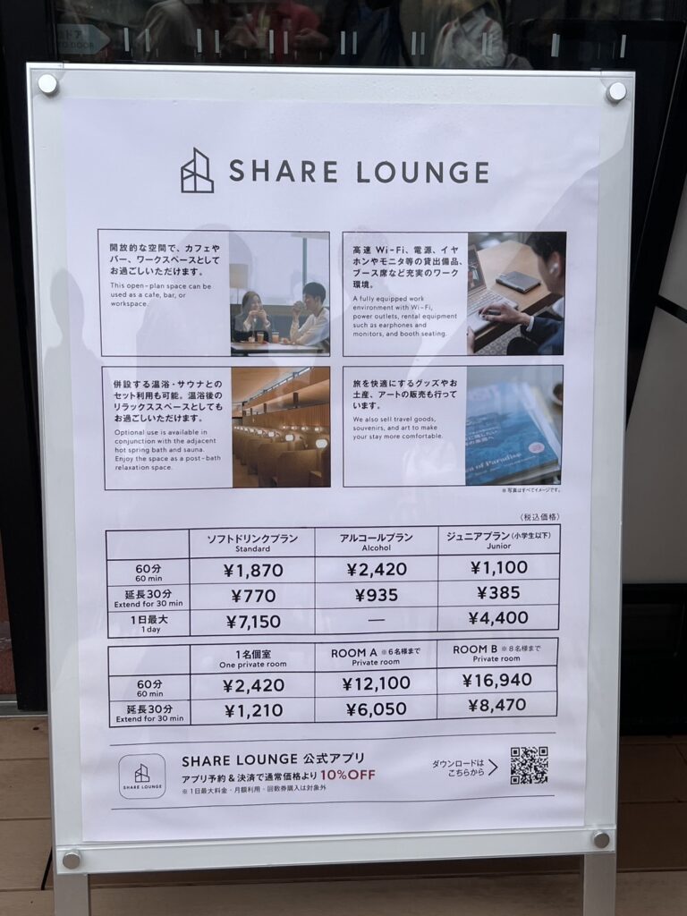 個室もあり、「1名様からご利用いただける個室」「最大8名様まで収容可能なモニター付き会議室」も完備しているとのこと。更には、賑わいエリア、ビジネスエリア、ドッグフレンドリーエリア、温浴裸足エリアもあったそうで…温浴裸足エリア…気になります!さくらいさん、続編リポートお待ちしております。(笑)